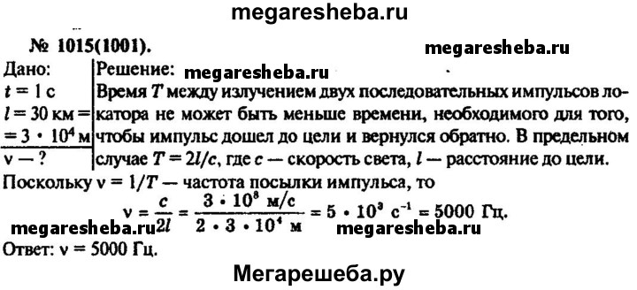 1015. Каким может быть максимальное число импульсов, посылаемых радиолокатором за 1 с, при разведывании цели, находящейся на расстоянии 30 км от него?