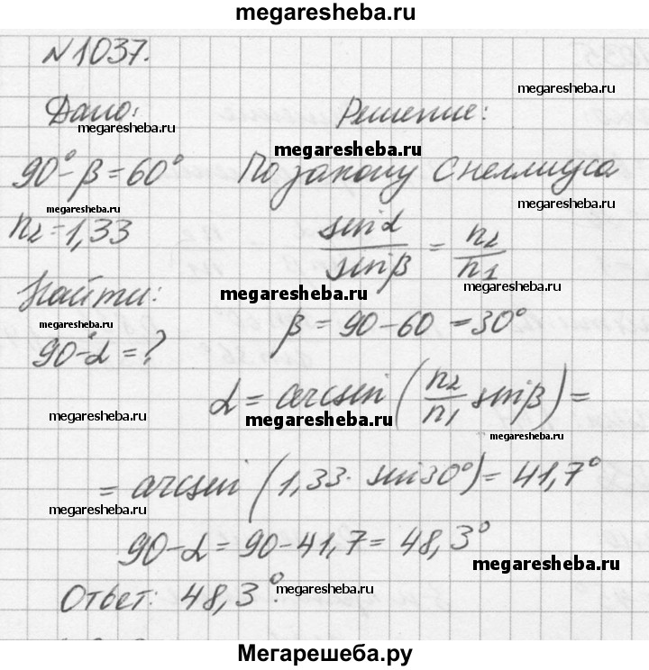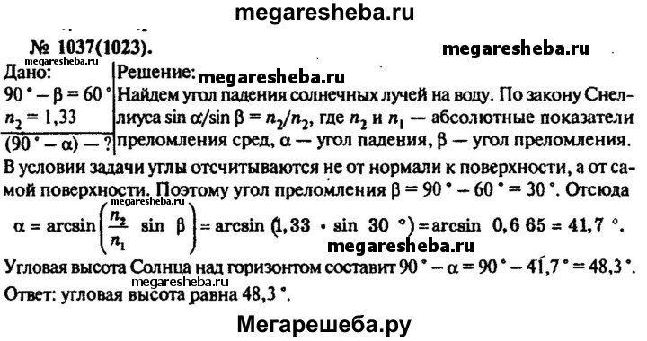 1037. Водолазу, находящемуся под водой, солнечные лучи кажутся падающими под углом 60° к поверхности воды. Какова угловая высота солнца над горизонтом?