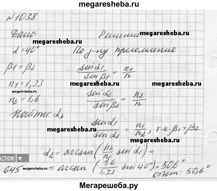 1038. Луч света падает на поверхность воды под углом 40°. Под каким углом должен упасть луч на поверхность стекла, чтобы угол преломления оказался таким же?