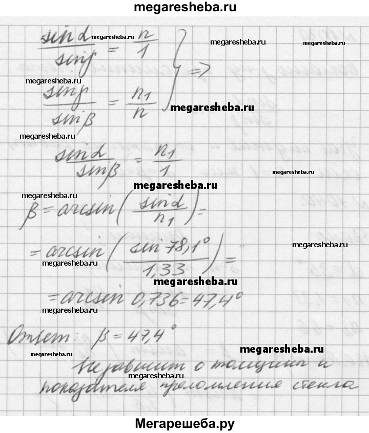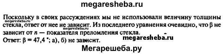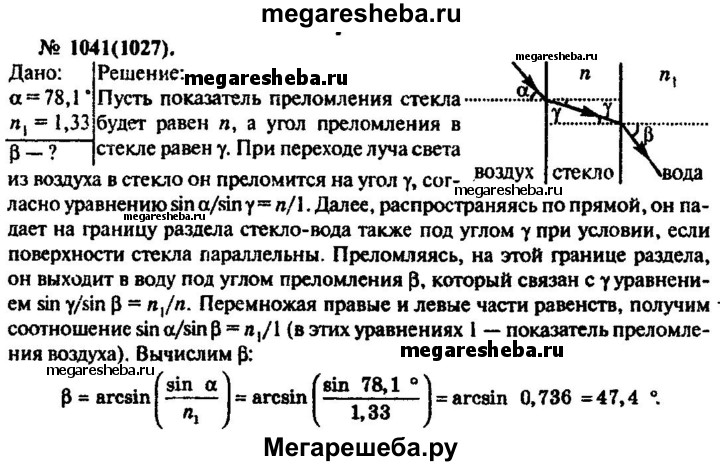 1041. Вода налита в аквариум прямоугольной формы. Угол падения луча света на стеклянную стенку 78,1°. Найти угол преломления луча в воде при выходе из стекла. Зависит ли ответ задачи от: а) толщины стенок; б) показателя преломления данного сорта стекла?