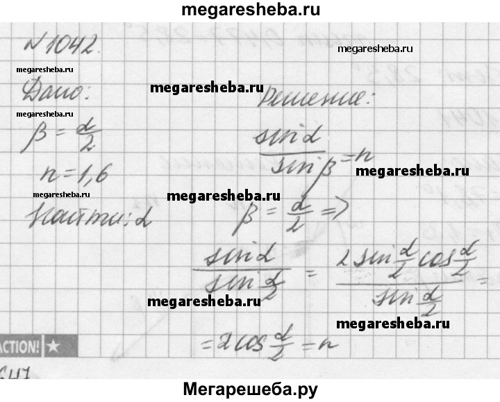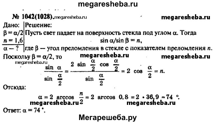 1042. Под каким углом должен падать луч на поверхность стекла, чтобы угол преломления был в 2 раза меньше угла падения?