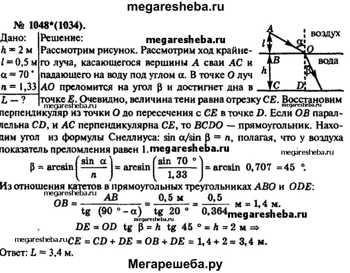1048. В дно водоёма глубиной 2 м вбита свая, на 0,5 м выступающая из воды. Найти длину тени от сваи на дне водоёма при угле падения лучей 70°.