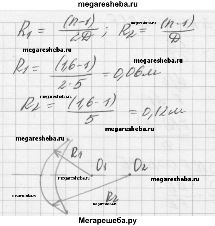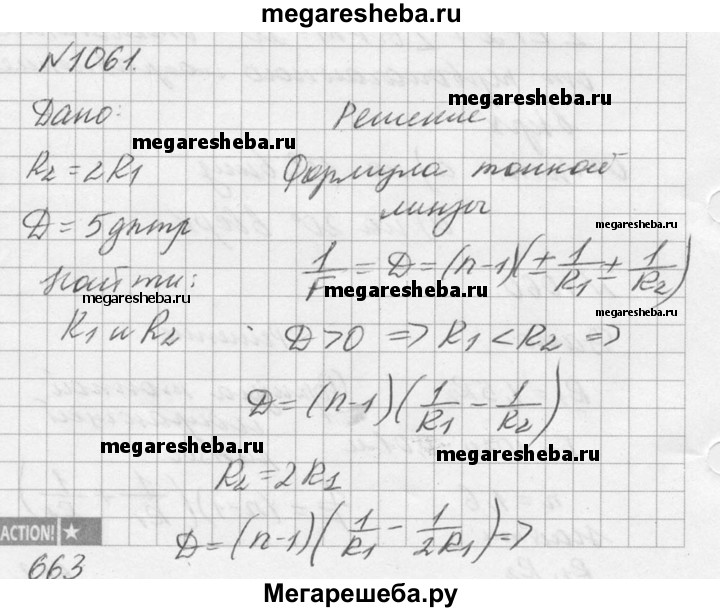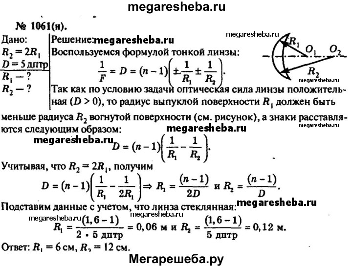 1061. Каковы радиусы кривизны поверхностей выпукло-вогнутой собирающей линзы с оптической силой 5 дптр, если один из них больше другого в 2 раза?