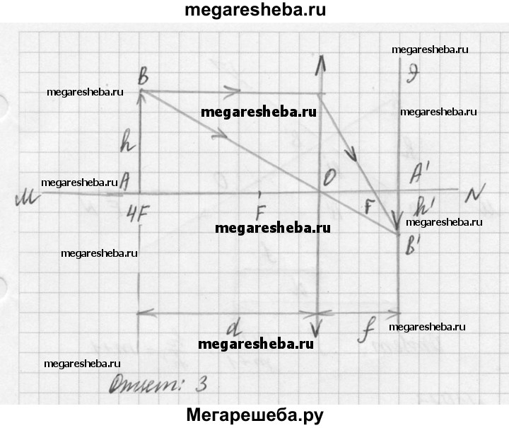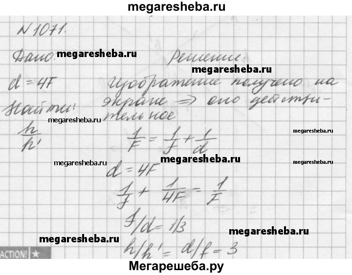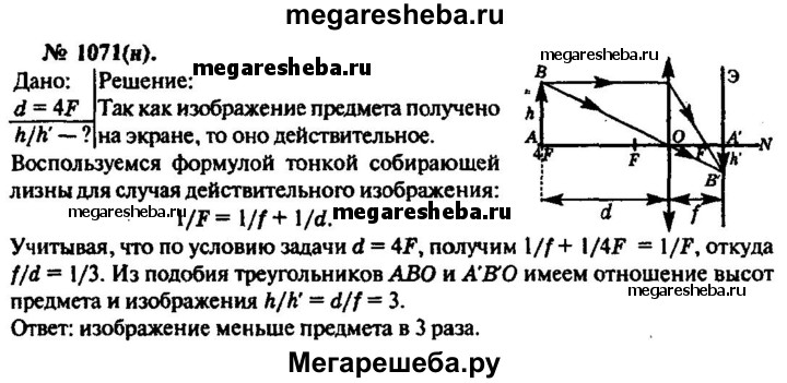 1071. Предмет находится на расстоянии 4F от линзы. Во сколько раз его изображение на экране меньше самого предмета?