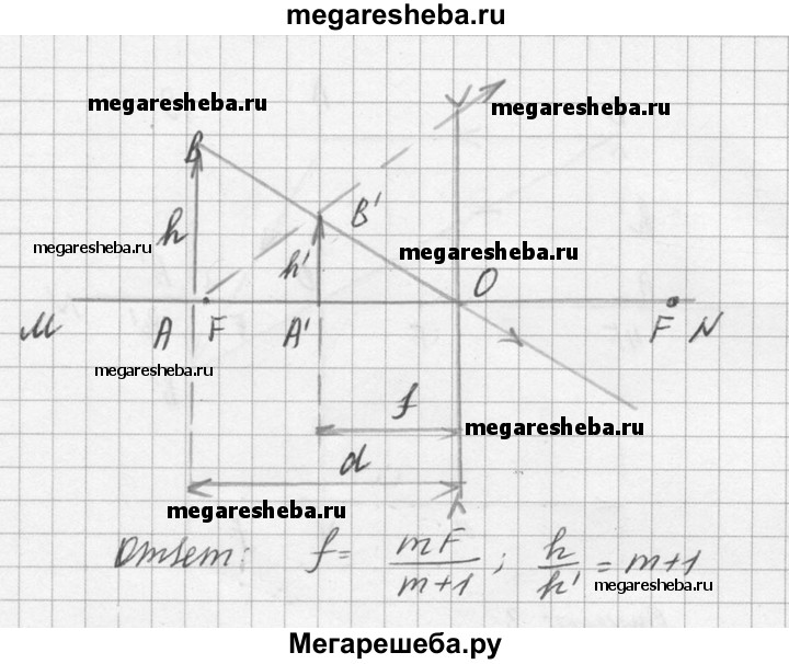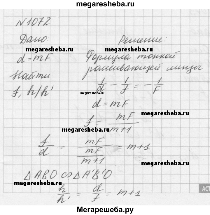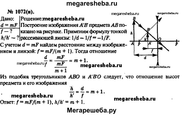 1072. Предмет находится перед рассеивающей линзой на расстоянии mF (где F — её фокусное расстояние). На каком расстоянии от линзы получится мнимое изображение и во сколько раз оно будет меньше самого предмета?
