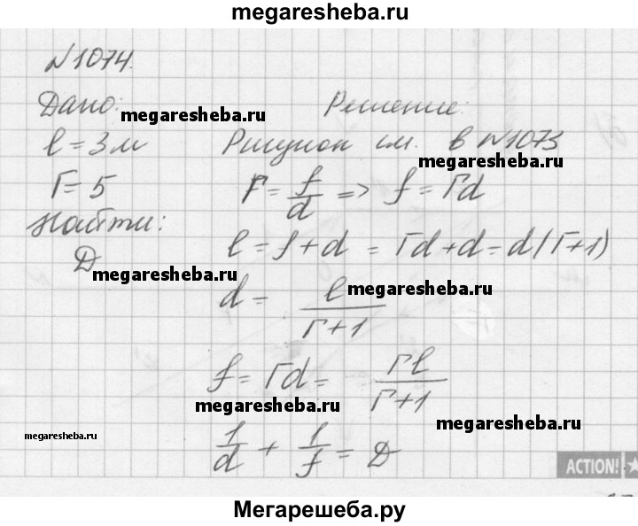 1074. Расстояние от предмета до экрана равно 3 м. Какой оптической силы надо взять линзу и где следует её поместить, чтобы получить изображение предмета, увеличенное в 5 раз?