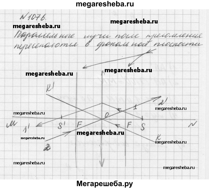 1076. На рисунке 118 показаны положение линзы, главной оптической оси, светящейся точки S и её изображения S'. Найти построением положения главных фокусов линзы.