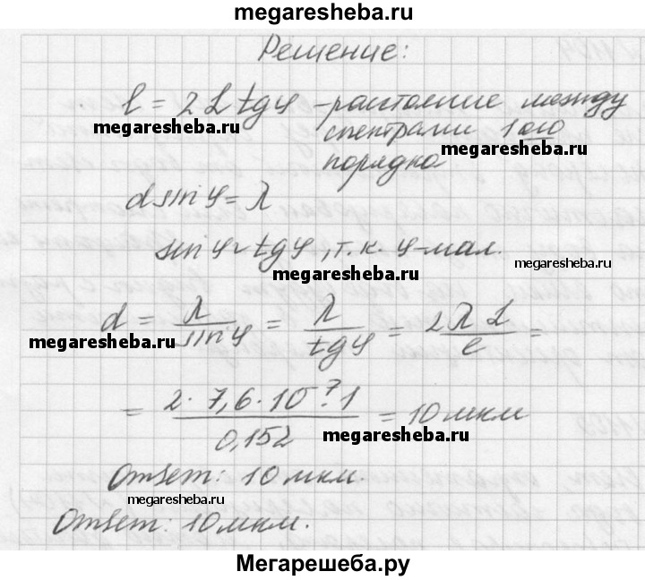 1102. Для определения периода решётки на неё направили световой пучок через красный светофильтр, пропускающий лучи с длиной волны 0,76 мкм. Каков период решётки, если на экране, отстоящем от решётки на 1 м, расстояние между спектрами первого порядка равно 15,2 см?