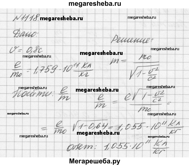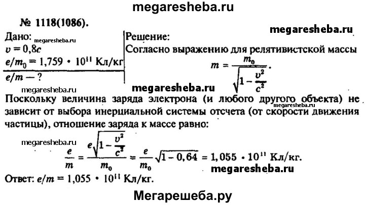 1118. Найти отношение заряда электрона к его массе при скорости движения электрона 0,8с. Отношение заряда электрона к его массе покоя известно.