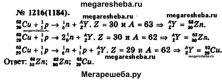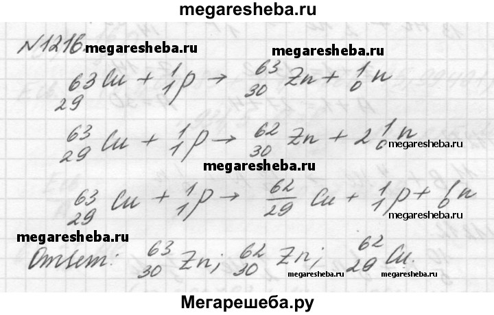 1216. При облучении изотопа меди 63(29)Си протонами реакция может идти несколькими путями: с выделением одного нейтрона; с выделением двух нейтронов; с выделением протона и нейтрона. Ядра каких элементов образуются в каждом случае?