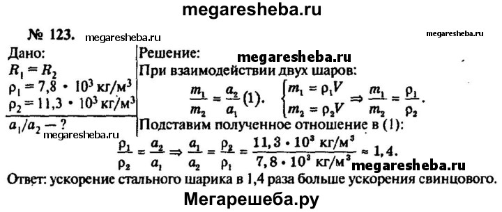 123. Найти отношение модулей ускорений двух шаров одинакового радиуса во время взаимодействия, если первый шар сделан из стали, а второй из свинца.