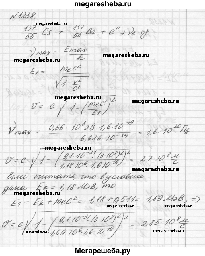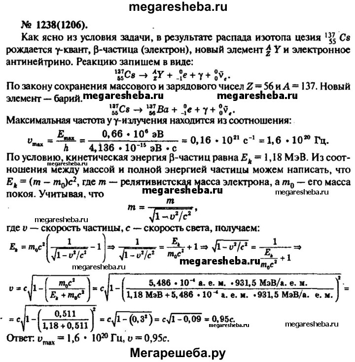 1238. В установках для у-облучения в сельском хозяйстве используется (З-радиоактивный изотоп цезия 137(55)Cs. Написать реакцию (3-распада. Найти максимальную частоту у-излучения, если наибольшая энергия у-квантов равна 0,66 МэВ. Вычислить релятивистскую скорость р-частиц, если их энергия 1,18 МэВ.