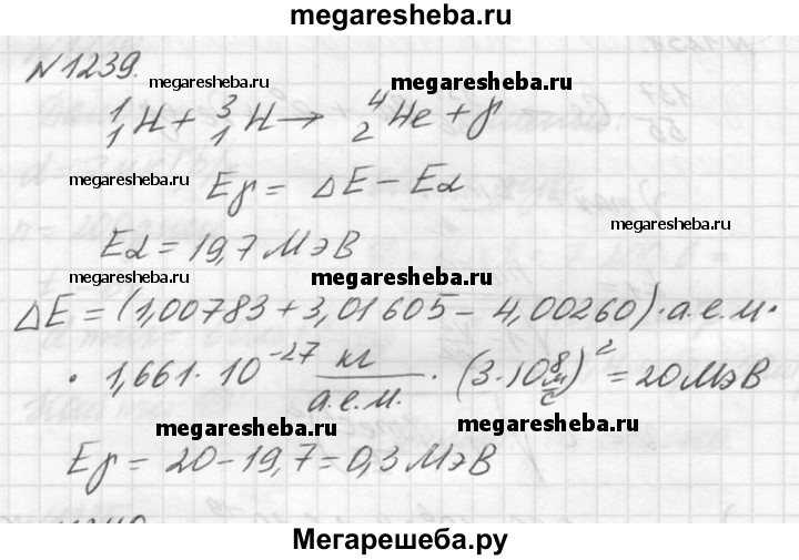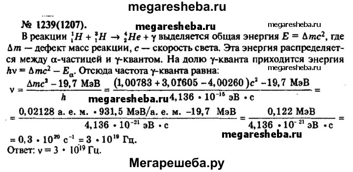 1239. Найти частоту у-излучения, образующегося при термоядерной реакции: 1(1)Н + 3(1)Н -> 4(2)Не + у, если а-частица приобретает энергию 19,7 МэВ.