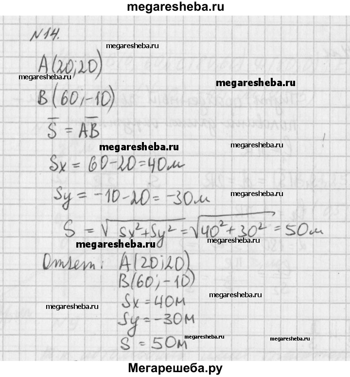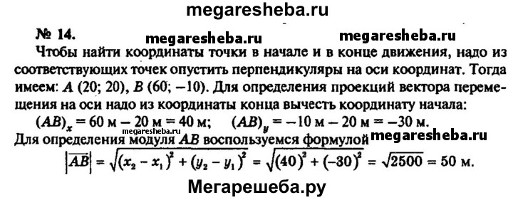 14. На рисунке 6 показана траектория движения материальной точки из А в В. Найти координаты точки в начале и конце движения, проекции перемещения на оси координат, модуль перемещения.