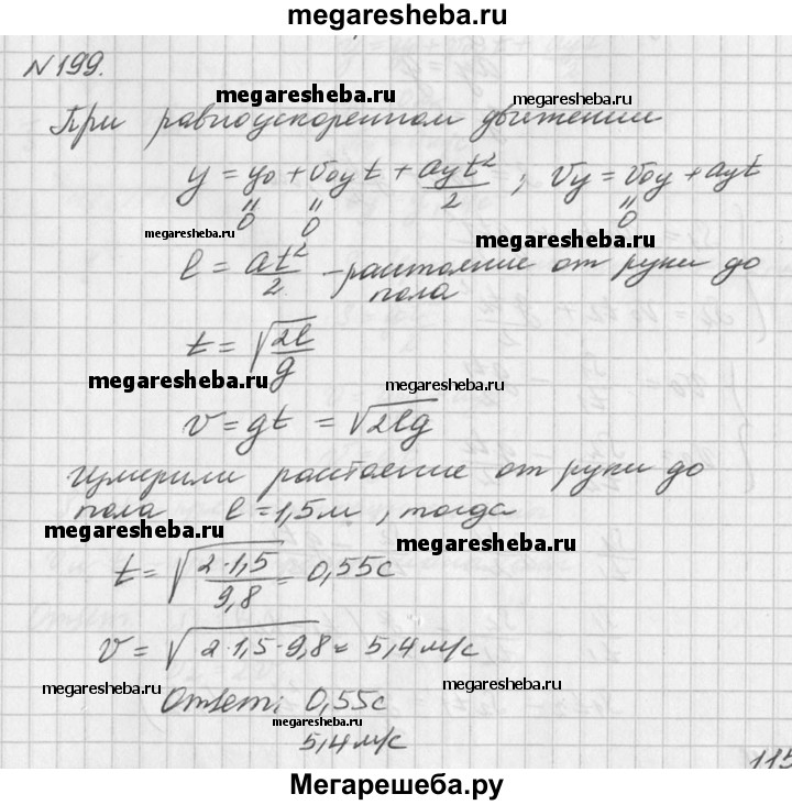 199. Измерить (или приблизительно оценить) расстояние от вытянутой горизонтально руки до пола. Вычислить время падения выпущенного из руки предмета и его скорость при ударе о пол.
