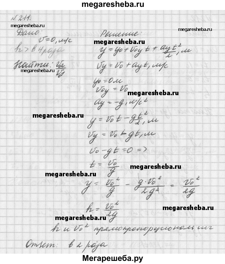211. Во сколько раз надо увеличить начальную скорость брошенного вертикально вверх тела, чтобы высота подъёма увеличилась в 4 раза?