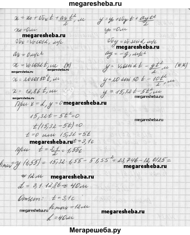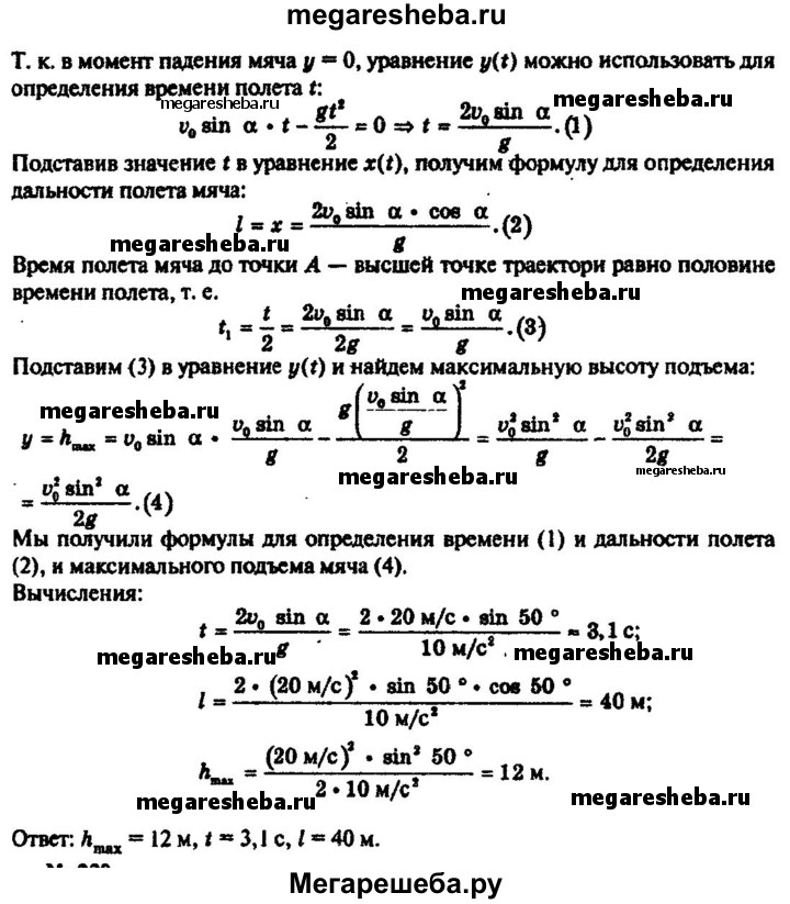 229. Вратарь, выбивая мяч от ворот (с земли), сообщил ему скорость 20 м/с, направленную под углом 50° к горизонту. Найти время полёта мяча, максимальную высоту подъёма и дальность полёта.