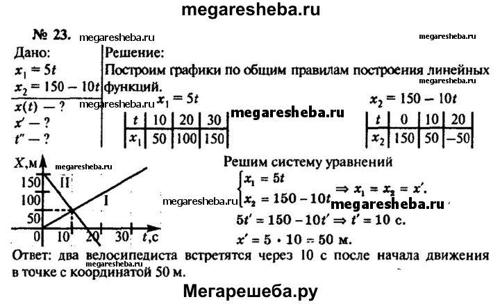 23. Движения двух велосипедистов заданы уравнениями: = 51, х2 = 150 - 10f. Построить графики зависимости x(t). Найти время и место встречи.