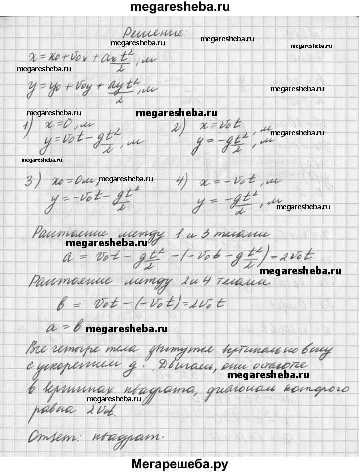 233. Из одной точки на достаточно большой высоте одновременно брошены четыре тела с одинаковыми по модулю скоростями = v2 = i>3 = v4 (рис. 34). По вершинам какой фигуры будут располагаться тела во время полёта?