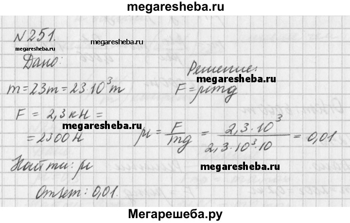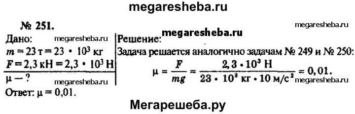 251. На соревнованиях лошадей тяжелоупряжных пород одна из них перевезла груз массой 23 т. Найти коэффициент сопротивления, если сила тяги лошади 2,3 кН.