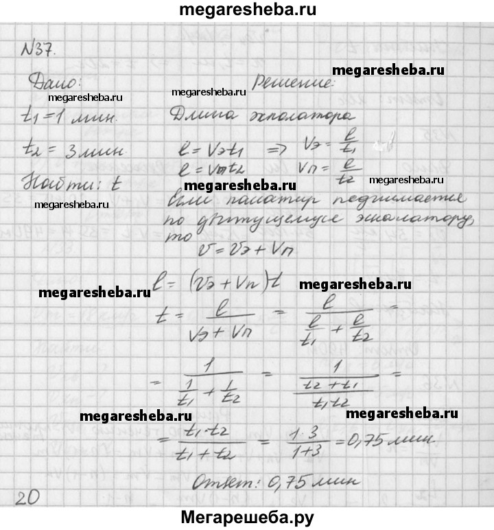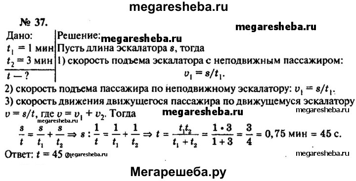 37. Эскалатор метро поднимает неподвижно стоящего на нём пассажира в течение 1 мин. По неподвижному эскалатору пассажир поднимается за 3 мин. Сколько времени будет подниматься идущий вверх пассажир по движущемуся эскалатору?
