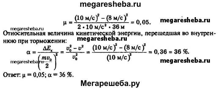 381. Велосипедист, прекратив работать педалями, на горизонтальном участке пути длиной 36 м уменьшил свою скорость с 10 до 8 м/с. Найти коэффициент сопротивления. Сколько процентов кинетической энергии превратилось во внутреннюю?