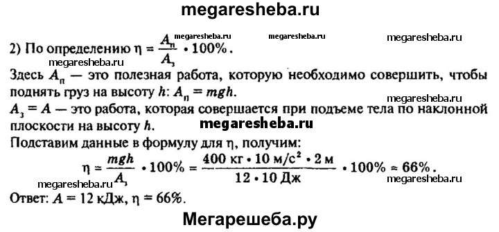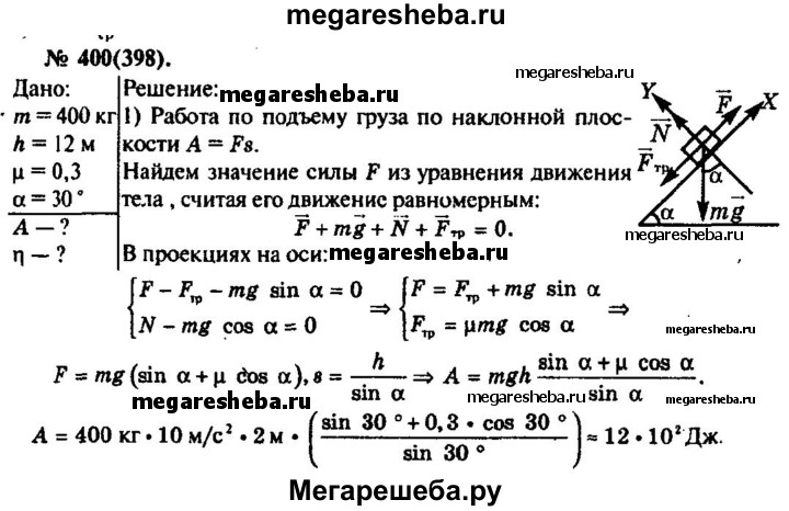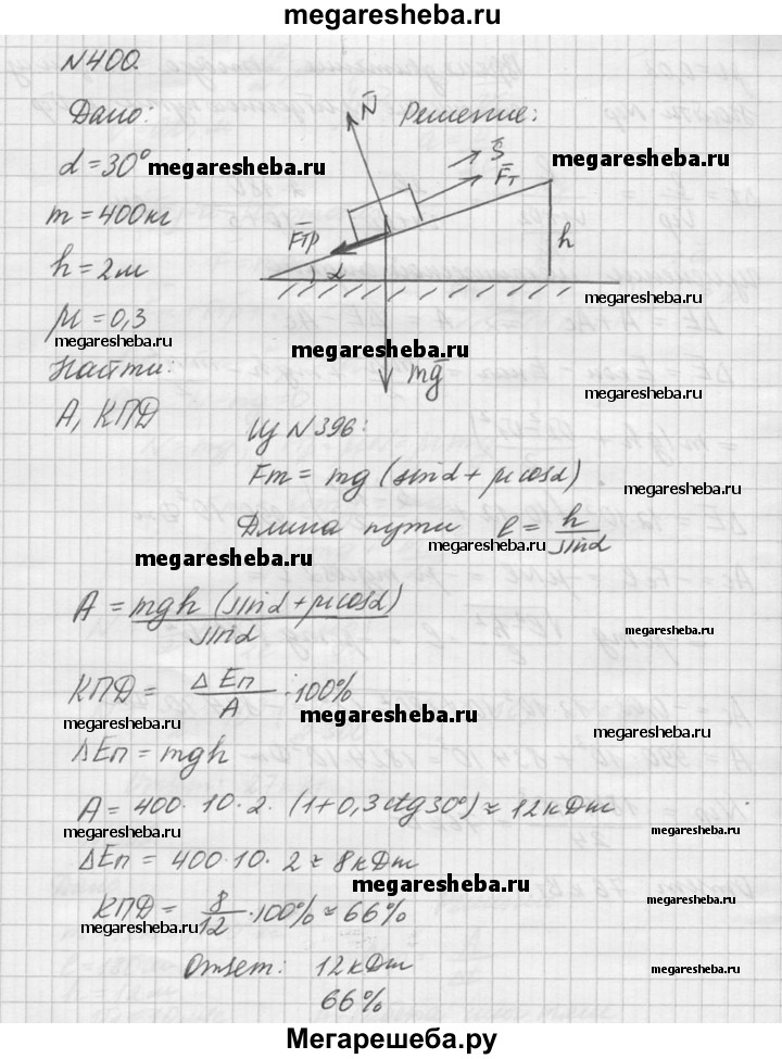 400. Какую наименьшую работу надо совершить, чтобы по плоскости с углом наклона 30° на высоту 2 м втащить груз, прикладывая силу, совпадающую по направлению с перемещением? Масса груза 400 кг, коэффициент трения 0,3. Каков при этом КПД?