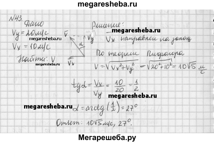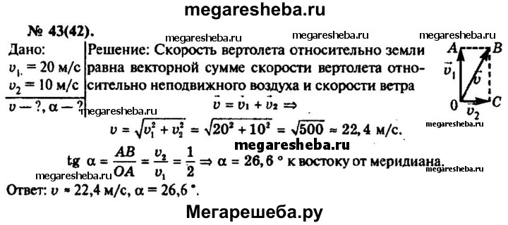 43. Вертолёт летел на север со скоростью 20 м/с. С какой скоростью и под каким углом к меридиану будет лететь вертолёт, если подует западный ветер со скоростью 10 м/с?