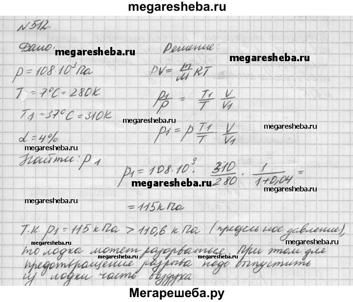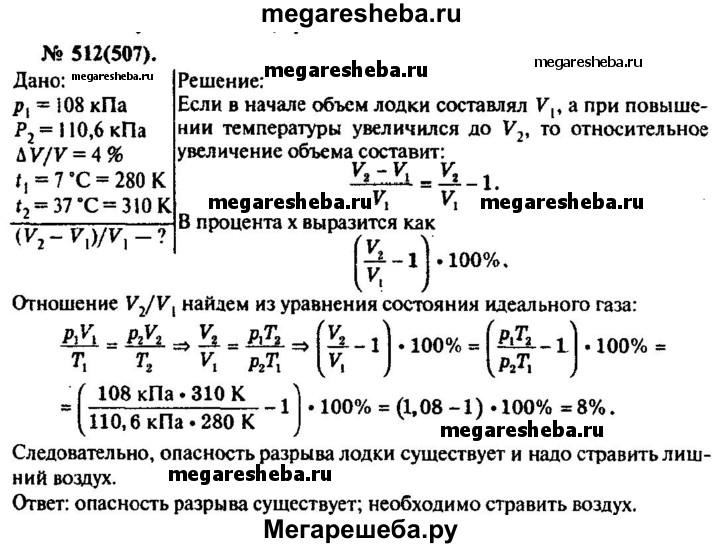 512. Резиновую лодку надули при температуре 7 °С до рабочего давления 108 кПа. Имеется ли опасность разрыва лодки при повышении температуры до 37 °С, если предельно допустимое давление 110,6 кПа и увеличение объёма не должно превышать 4%? Что надо сделать для предотвращения опасности разрыва?