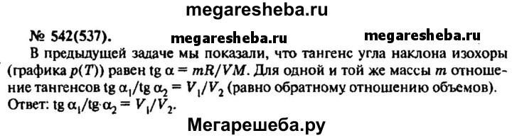 542. На рисунке 61 представлены две изохоры для газа одной и той же массы. Как относятся объёмы газа, если углы наклона изохор к оси абсцисс равны и а2?