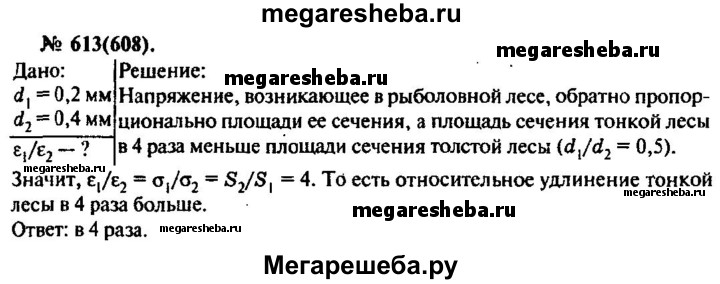613. Во сколько раз относительное удлинение рыболовной лесы диаметром 0,2 мм больше, чем лесы диаметром 0,4 мм, если к их концам приложены одинаковые силы?