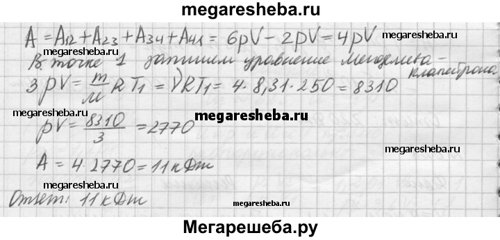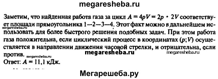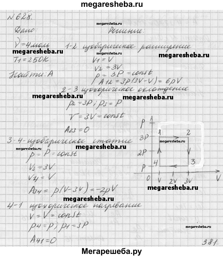 628. Идеальный газ в количестве 4 моль изобарически нагревают при давлении 3р так, что его объём увеличивается в 3 раза. Затем газ изохорически охлаждают до давления р, после чего изобарически сжимают до первоначального объёма и изохорически нагревают до начальной температуры Т1 = 250 К. Изобразить циклический процесс в координатах р, V и определить работу газа в этом процессе.