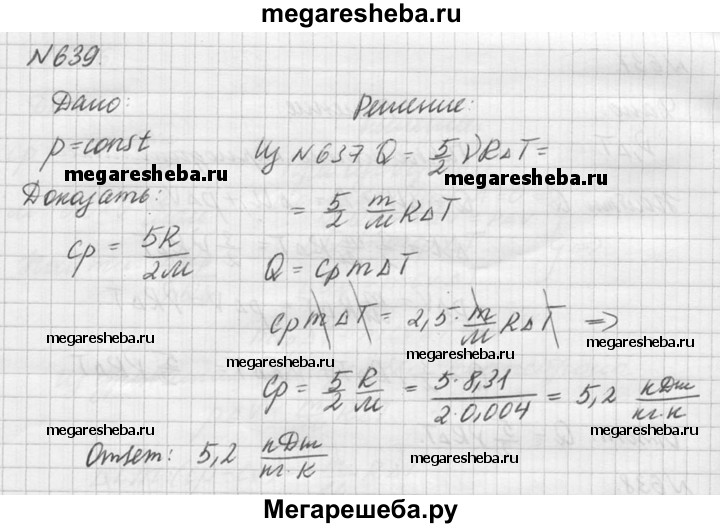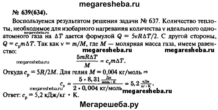 639. Доказать, что при постоянном давлении удельная теплоёмкость одноатомного газа, молярная масса которого М, находится по формуле ср = . Найти удельную теплоёмкость гелия при постоянном давлении.