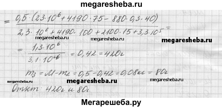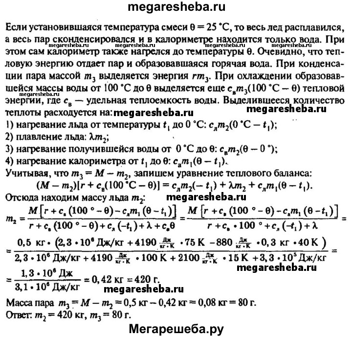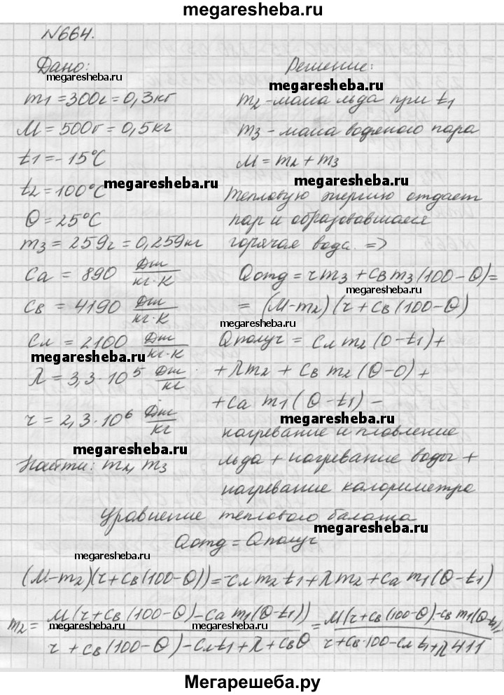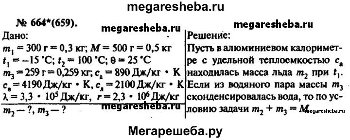 664. В алюминиевый калориметр массой 300 г опустили кусок льда. Температура калориметра и льда -15 °С. Затем пропустили через калориметр водяной пар при 100 °С. После того как температура смеси стала 25 °С, измерили массу смеси, она оказалась равной 500 г. Найти массу сконденсировавшегося пара и массу льда, находившегося в калориметре в начале опыта.