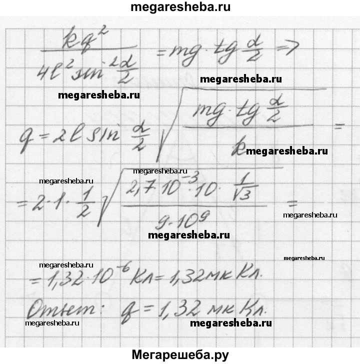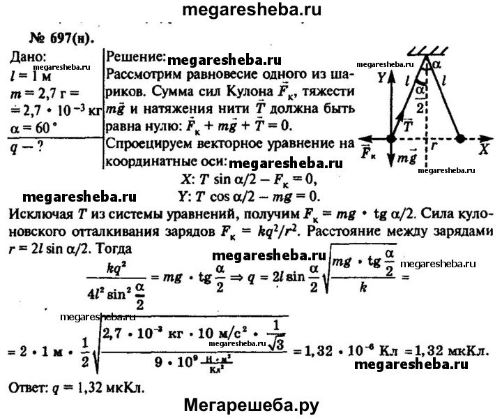 697. На нитях длиной 1 м, закреплённых в одной точке, подвешены два одинаковых шарика массой 2,7 г каждый. Когда шарикам сообщили одинаковые одноимённые заряды, они разошлись и нити образовали угол 60°. Найти заряд каждого шарика.