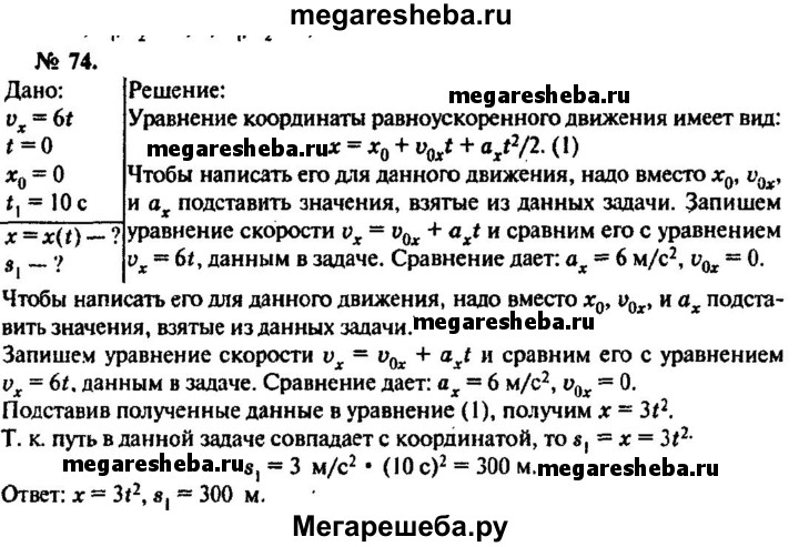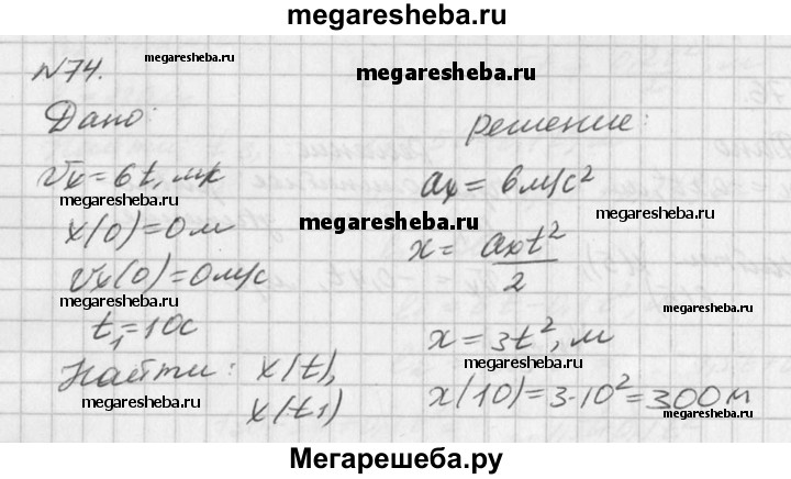 74. Зависимость скорости материальной точки от времени задана формулой vx = 6*. Написать уравнение движения х = x(t), если в начальный момент (t = 0) движущаяся точка находилась в начале координат (х = 0). Вычислить путь, пройденный материальной точкой за 10 с.