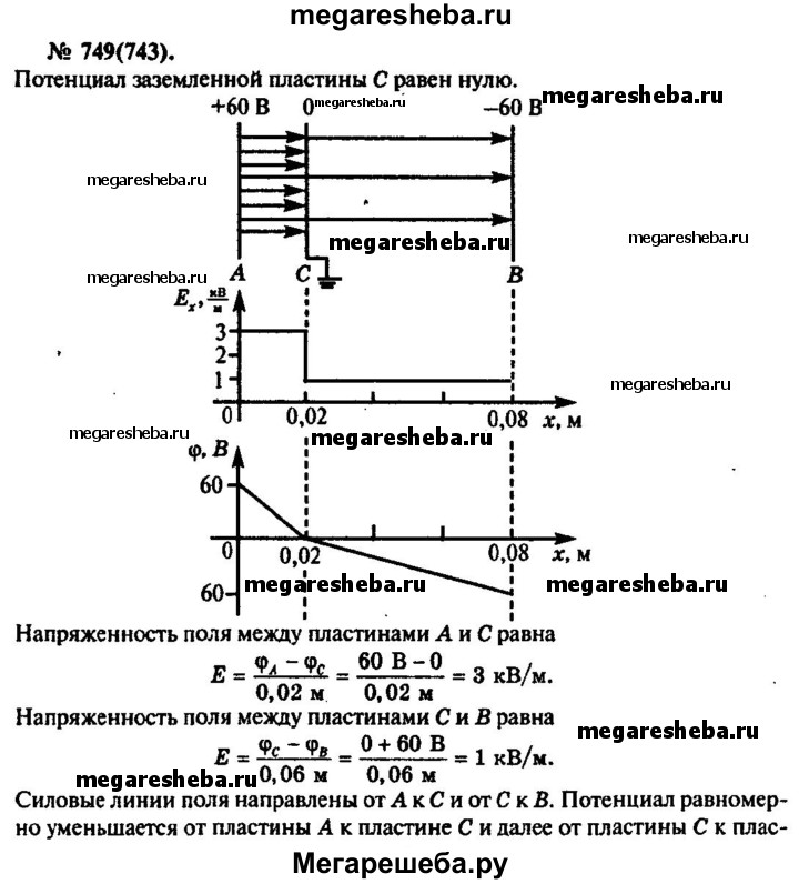 749. На пластинах А и В, расположенных параллельно на расстоянии 8 см друг от друга, поддерживаются потенциалы +60 и -60 В соответственно. Между ними поместили заземлённую пластину С на расстоянии 2 см от пластины А. На сколько изменилась напряжённость поля на участках АС и СВ? Построить графики зависимостей ф(дг) и Ех(х), расположив ось X так же, как в предыдущей задаче.