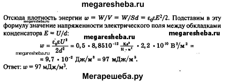 771. Расстояние между пластинами плоского конденсатора с диэлектриком из бумаги, пропитанной парафином, равно 2 мм, а напряжение между пластинами 200 В. Найти плотность энергии поля.