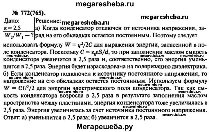 772. Во сколько раз изменится энергия поля заряженного конденсатора, если пространство между пластинами конденсатора заполнить маслом? Рассмотреть случаи: а) конденсатор отключён от источника напряжения; б) конденсатор остается присоединённым к источнику постоянного напряжения. Ответ объяснить, пользуясь законом сохранения энергии.
