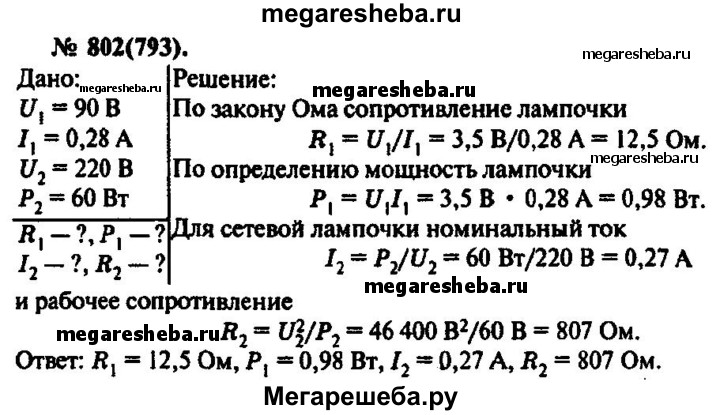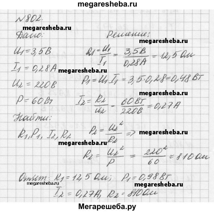 802. На доколе лампочки карманного фонаря написано: 3,5 В, 0,28 А. Найти сопротивление в рабочем режиме и потребляемую мощность. На баллоне сетевой лампы накаливания написано: 220 В, 60 Вт. Найти силу тока и сопротивление в рабочем режиме.