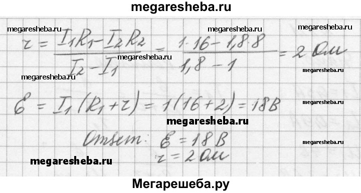 822. При подключении к батарее гальванических элементов резистора сопротивлением 16 Ом сила тока в цепи была 1 А, а при подключении резистора сопротивлением 8 Ом сила тока стала 1,8 А. Найти ЭДС и внутреннее сопротивление батареи. При возможности выполните работу экспериментально, используя два резистора, сопротивления которых известны, и амперметр.