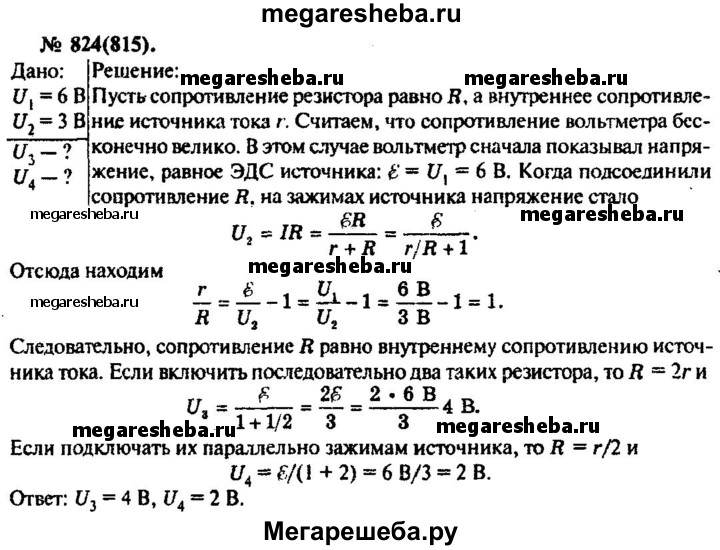 824. Вольтметр, подключённый к зажимам источника тока, показал 6 В. Когда к тем же зажимам подключили резистор, вольтметр стал показывать 3 В. Что покажет вольтметр, если вместо одного подключить два таких же резистора, соединённых последовательно; параллельно?