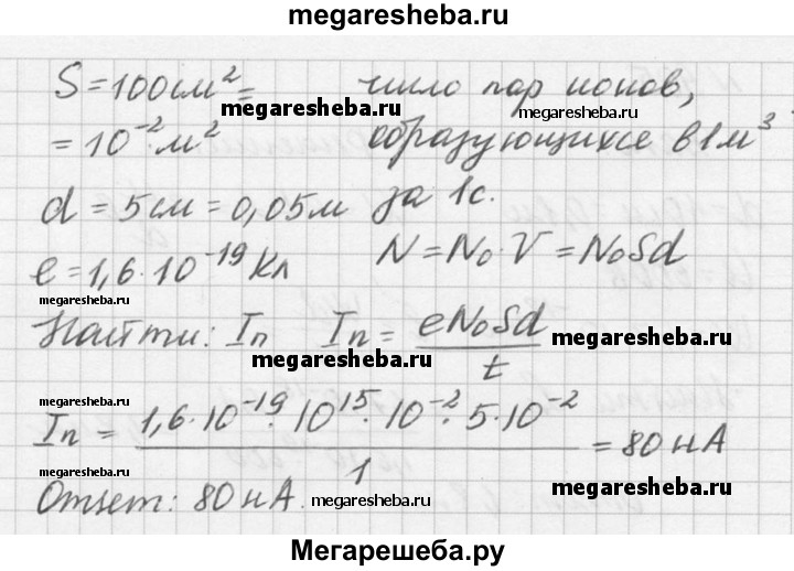 903. Какова сила тока насыщения при несамостоятельном газовом разряде, если ионизатор образует ежесекундно 109 пар ионов в одном кубическом сантиметре? Площадь каждого из двух плоских параллельных электродов 100 см2, расстояние между ними 5 см.