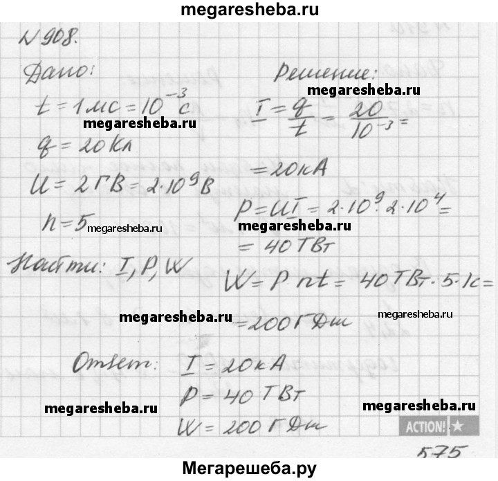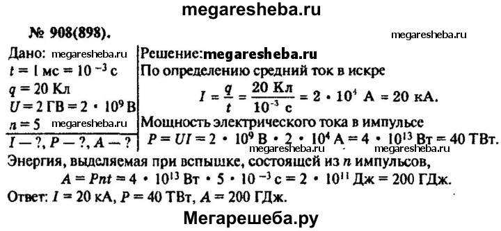 Подробный решебник (ГДЗ) по Физике за 10‐11 (десятый‐одиннадцатый) класс задачник - готовый ответ номер - 908. Авторы учебника: Рымкевич. Издательство: Дрофа 2016.