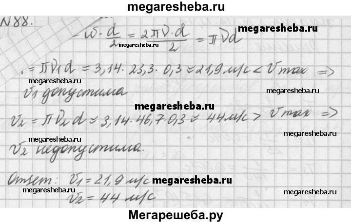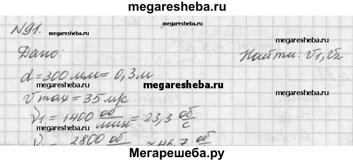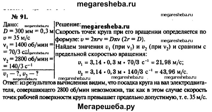 91. Скорость точек рабочей поверхности наждачного круга диаметром 300 мм не должна превышать 35 м/с. Допустима ли посадка круга на вал электродвигателя, совершающего 1400 об/мин; 2800 об/мин?