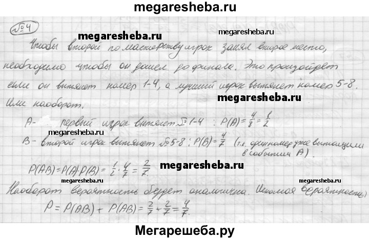 4. В турнире участвуют 8 игроков. Номер, вытаскиваемый игроком наугад, определяет его положение в турнирной сетке (рис. 42). Будем считать, что лучший игрок всегда побеждает второго по мастерству, который (в свою очередь) побеждает всех остальных.? Проигрывающий в финале занимает второе место. Какова вероятность того, что это место займёт второй по мастерству игрок?