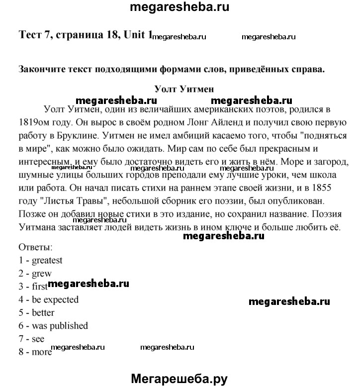 Подробный решебник (ГДЗ) по Английскому языку за 10 (десятый) класс Контрольные задания - готовый ответ unit 1 grammar tests - 7. Авторы учебника: Афанасьева, Михеева, Углубленный уровень. Издательство: Просвещение 2016.