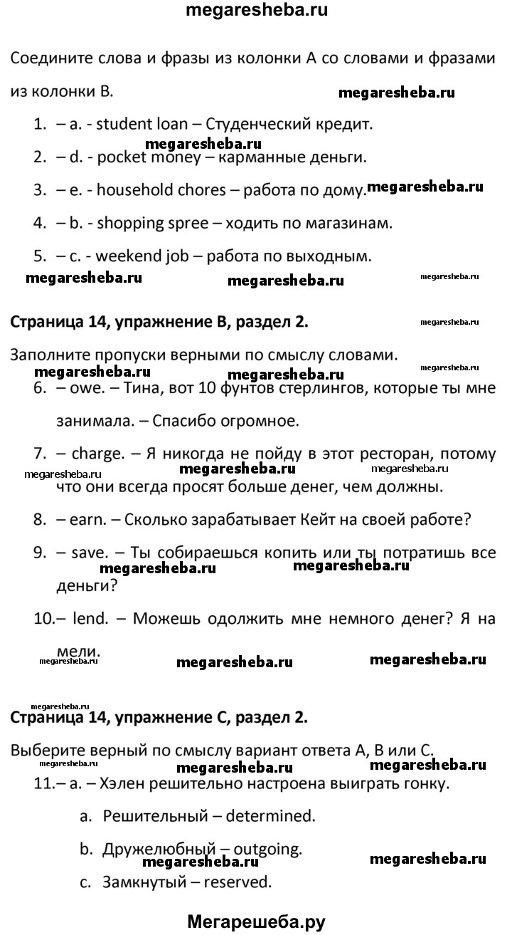 Подробный решебник (ГДЗ) по Английскому языку за 10 (десятый) класс Контрольные задания Spotlight - готовый ответ страница - 14. Авторы учебника: Афанасьева, Дули, Михеева, Эванс. Издательство: Просвещение 2017.