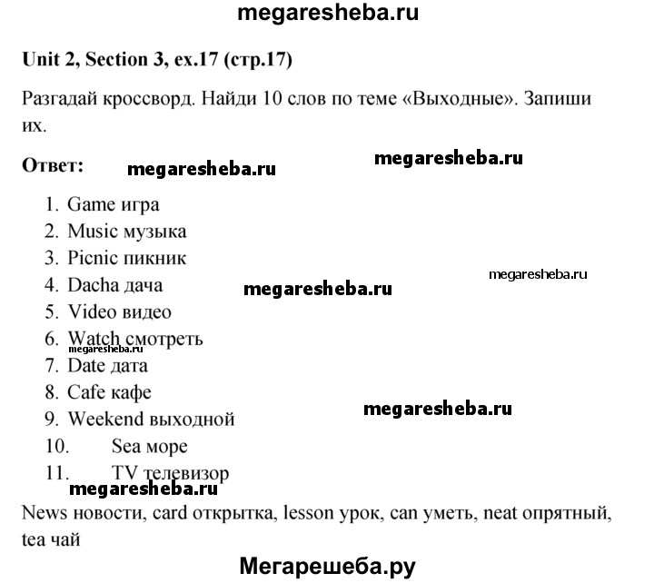 Подробный решебник (ГДЗ) по Английскому языку за 5‐6 (пятый‐шестой) класс рабочая тетрадь - готовый ответ unit 2 - 17. Авторы учебника: Биболетова, Добрынина, Трубанева. Издательство: Титул 2016.
