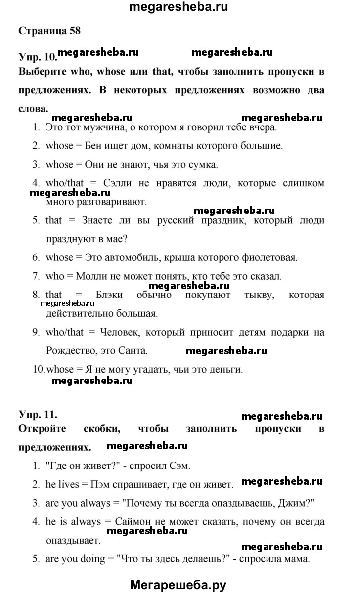 Подробный решебник (ГДЗ) по Английскому языку за 6 (шестой) класс лексико-грамматический практикум Rainbow - готовый ответ страница - 58. Авторы учебника: Афанасьева, Михеева, Баранова. Издательство: Дрофа 2016.